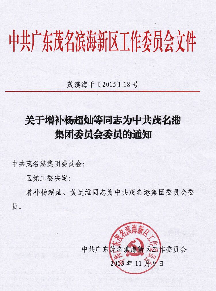 新區(qū)黨工委決定:增補楊超燦、黃遠維為同志為中共茂名港集團委員會委員