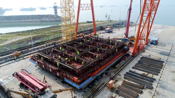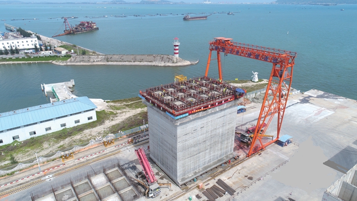 本次沉箱澆筑施工采取整體滑模工藝,澆筑過程中共采用164臺液壓千斤頂,以液壓千斤頂為提升動力部件,配合爬桿、提升架將模板整體提升,需連續(xù)滑升施工70多小時。據(jù)了解,為降低沉箱出運(yùn)風(fēng)險,本次采取降低沉箱上部高度工藝進(jìn)行澆筑(一次澆筑高度21.5m),在沉箱安裝后以二次現(xiàn)澆接高的施工方式達(dá)到該件沉箱設(shè)計高度25.5m,沉箱總重量達(dá)4512t。