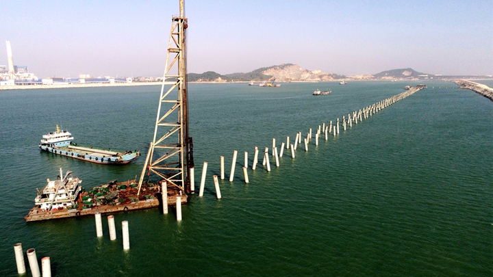 油品碼頭工程新建1個10萬噸級油品泊位、4384米公用管廊及配套設(shè)施。水域公用管廊鋼管樁總量607根,其中斜樁322根,直樁285根。公共管廊建成后將為東區(qū)13個液體化工品泊位提供服務(wù),是博賀新港區(qū)重要的前置性基礎(chǔ)工程,也是打造南海能源新通道的奠基工程。本次樁基工程提前完工,對工程整體進(jìn)度推進(jìn)具有重要意義。