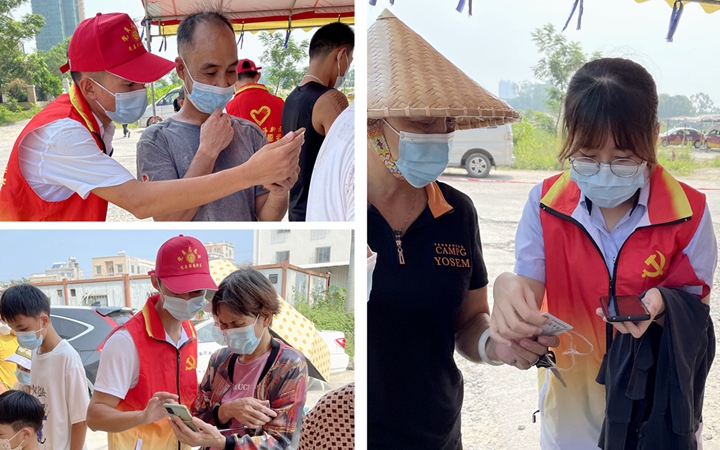 “請各位小朋友和老人家戴好口罩,也請各位家長到這邊掃碼,提前準(zhǔn)備好他們的核酸碼,前往那邊排隊,間隔一米距離!秉h員志愿者在協(xié)助做好核酸檢測工作的同時,擔(dān)負起核酸檢測秩序維護、安全注意事項提醒的職責(zé)。 核酸檢測的現(xiàn)場有獨自前來的老人家,他們有的不知道如何使用手中的智能手機,有的只有一部舊式按鍵手機。集團黨員志愿者們耐心地幫他們錄入個人信息,成功進行核酸檢測。為照顧本地群眾的語言習(xí)慣,集團志愿者還貼心地用粵語、普通話還有“夾生”黎話(當(dāng)?shù)胤窖裕┹喎M行了“多語種”宣導(dǎo)。集團黨員志愿者熱情友好的志愿服務(wù)得到了現(xiàn)場群眾和其他志愿者的一致好評!