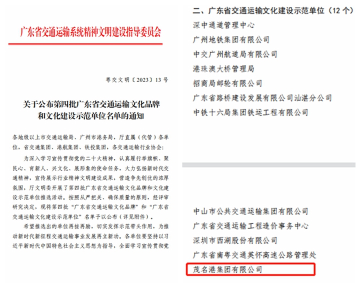 日前,廣東省交通運輸系統(tǒng)精神文明建設(shè)指導(dǎo)委員會公布了第四批廣東省交通運輸文化品牌和文化建設(shè)示范單位名單,茂名港集團(tuán)被評為“廣東省交通運輸文化建設(shè)示范單位”。