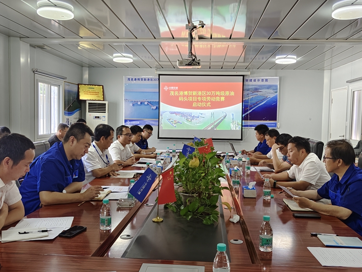 2023年9月19日,茂名港博賀新港區(qū)30萬噸級原油碼頭項(xiàng)目臨時(shí)黨支部主辦的“齊心協(xié)力,奮戰(zhàn)百天,沖刺全年指標(biāo)”專項(xiàng)勞動競賽啟動儀式在30萬噸級原油碼頭項(xiàng)目部辦公區(qū)成功舉辦。集團(tuán)黨委委員、總工程師蔡光章出席啟動儀式并講話。
