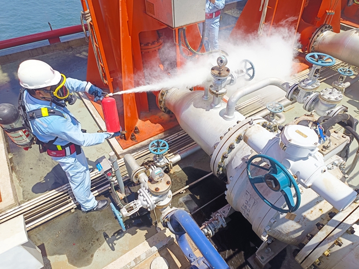 演練現場,警報聲響起,人員、車輛迅速集結到位。按照搶險救災組、疏散警戒組、通訊聯絡組、后勤保障組、醫(yī)療救護組、后勤醫(yī)療組等五個工作組的分工要求,參演人員各就各位、各司其責。他們有的迅速疏散無關人員完成現場警戒;有的迅速向市公司指揮中心及相關部門報告情況;有的迅速使用消防水泵泡沫泵、干粉滅火器撲滅初期火災,并對泊位E2裝卸區(qū)進行全面冷卻;有的迅速開展醫(yī)療及后勤等方面的應急處理。各參演小組反應快速、緊密配合、協(xié)同作戰(zhàn),現場警戒、人員疏散、滅火救援、后勤保障等各項應急動作有序進行,處理流程和處理措施合理有效。