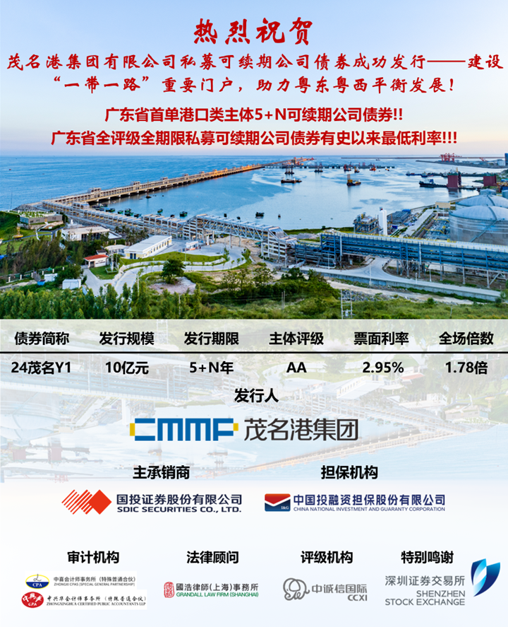 2024年8月28日,茂名港集團有限公司2024年面向?qū)I(yè)投資者非公開發(fā)行可續(xù)期公司債券(第一期)在深圳證券交易所成功發(fā)行。本期債券發(fā)行規(guī)模10億元,債券期限5+N年,發(fā)行利率2.95%,全場認購倍數(shù)達1.78倍,由國投證券股份有限公司擔任主承銷商及簿記管理人,由專業(yè)擔保機構(gòu)中國投融資擔保股份有限公司(主體評級AAA)作為擔保人,是廣東省首單港口類主體5+N可續(xù)期公司債券,發(fā)行利率創(chuàng)廣東省全評級全期限私募可續(xù)期公司債券有史以來最低利率。