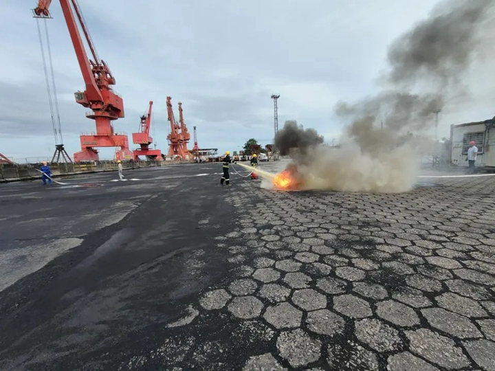 港口經(jīng)營公司開展港口設(shè)施保安暨碼頭消防綜合應急演練,模擬裝船作業(yè),因有疑似恐怖分子從海上手持兇器強行登陸實施縱火,演練人員迅速響應,配合默契,開展消防滅火、搶險救援、港口設(shè)施保安、防海洋環(huán)境污染、醫(yī)療及后勤等應急處理。